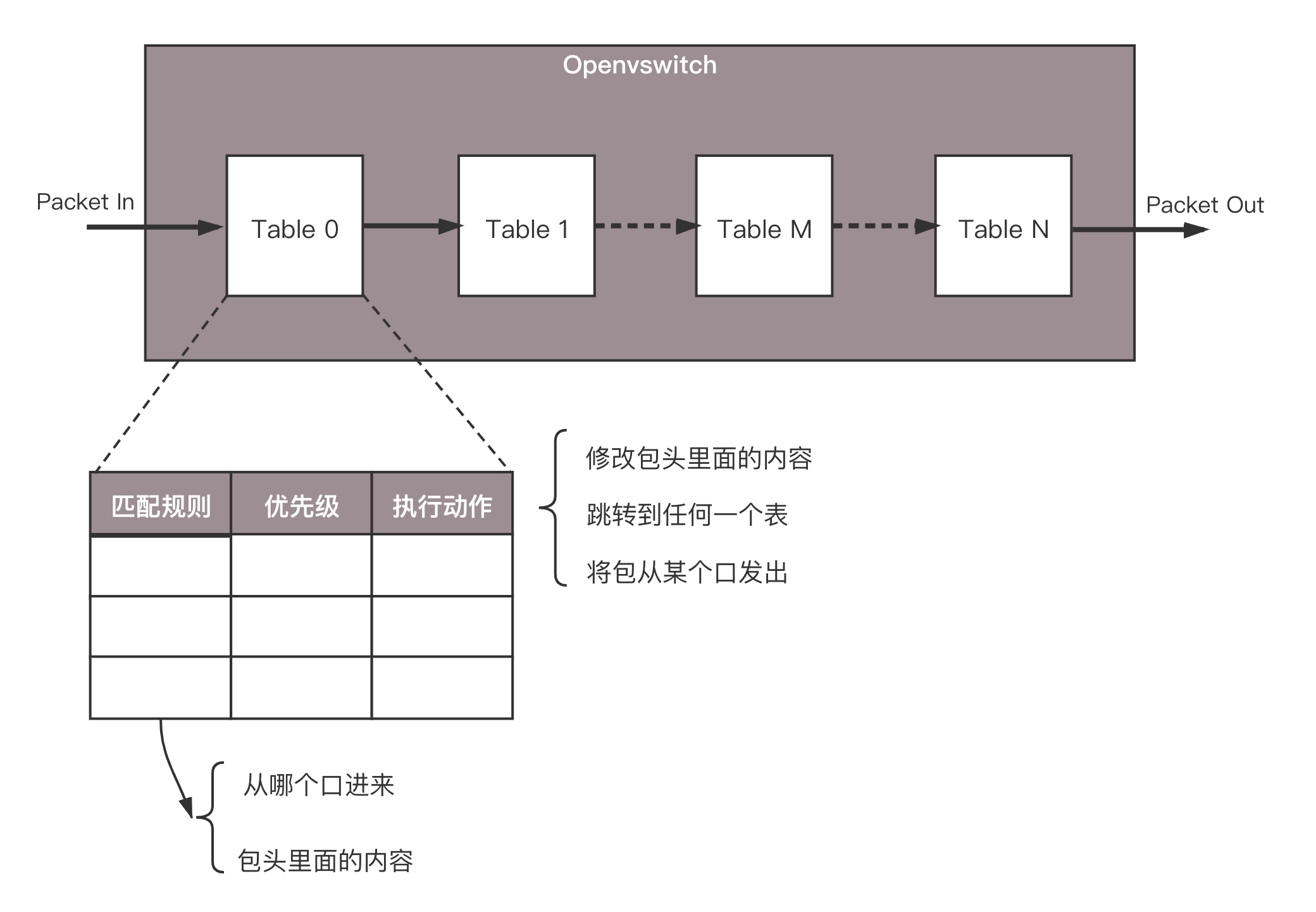 前两种在同一时刻内只有一个分组能被处理,最后一种如果输出端口不同,则能并行转发