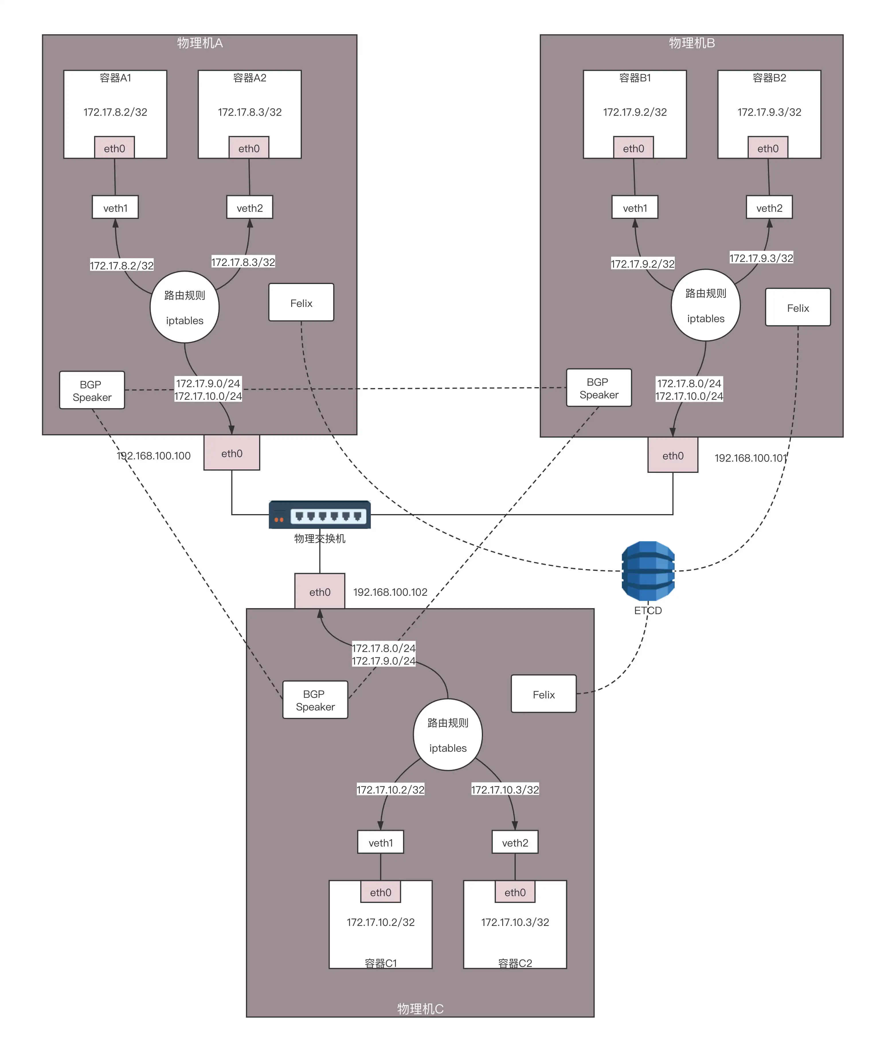Felix 负责在宿主机上插入路由规则。除了对路由信息的维护方式之外,Calico 项目与 Flannel 的 host-gw 模式的另一个不同之处,就是它不会在宿主机上创建任何网桥设备